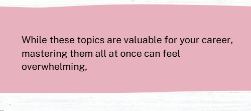 While these topics are valuable for your career, mastering them all at once can feel overwhelming, especially if you’re balancing a full-time job or family obligations.