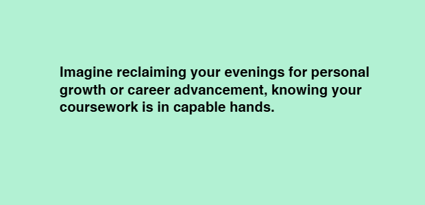 Imagine reclaiming your evenings for personal growth or career advancement, knowing your coursework is in capable hands. Our approach is student-centered, focusing on your unique schedule and goals. No more late-night cramming or worrying about deadlines—our professionals manage it all seamlessly.